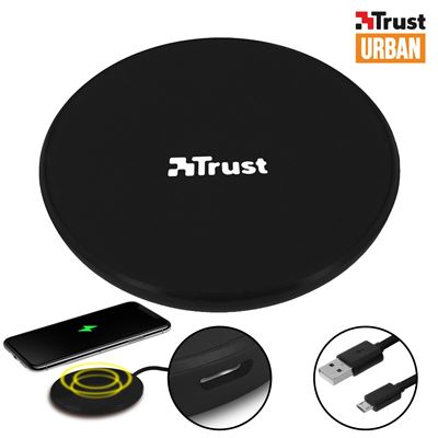 Base de carga por indução Qi de Trust Urban. Compacto e leve e com potência de 5W para uma carga rápida e segura. Inclui cabo micro-USB.