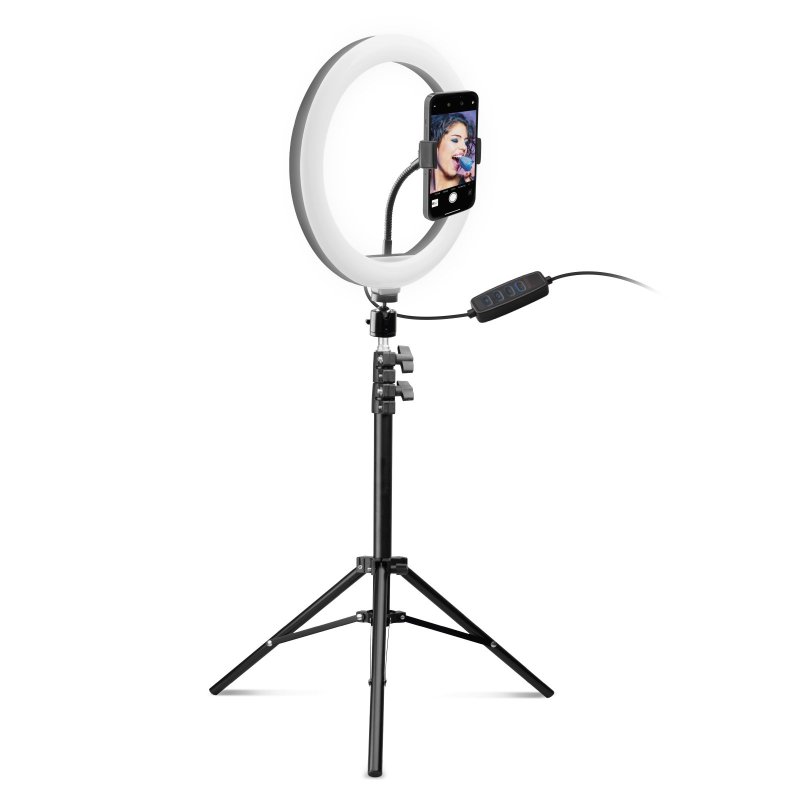 Anel de luz LED de 10.1″ com tripé (170cm) e suporte para o telemóvel. Ideal para tik-tok®, live streaming, ensaio fotográfico e partilha. Inclui obturador com fio. Luz branca quente/ amarela (120 LED) com 10 níveis de luminosidade.